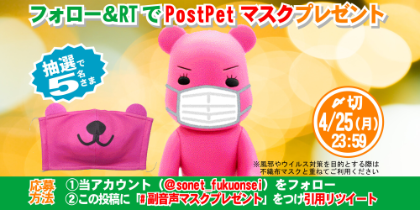 ピンクのPostPetマスクをプレゼント XのSo-net公式副音声が、懸賞好きさんと繋がりたいキャンペーンとして、ピンクのPostPetマスクを5名にプレゼントします。 参加方法は、So-net公式副音声をフォローして、当該ツイートにハッシュタグ#副音声マスクプレゼントをつけて引用リツイートするだけです。申込期限は、4月25日の23:59までとなっています。 ![]() |